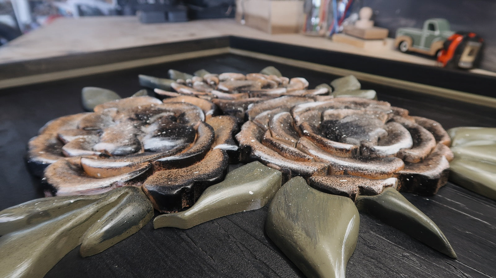 Hand cut, hand painted dark peonies on a black textured, double trim backer.
